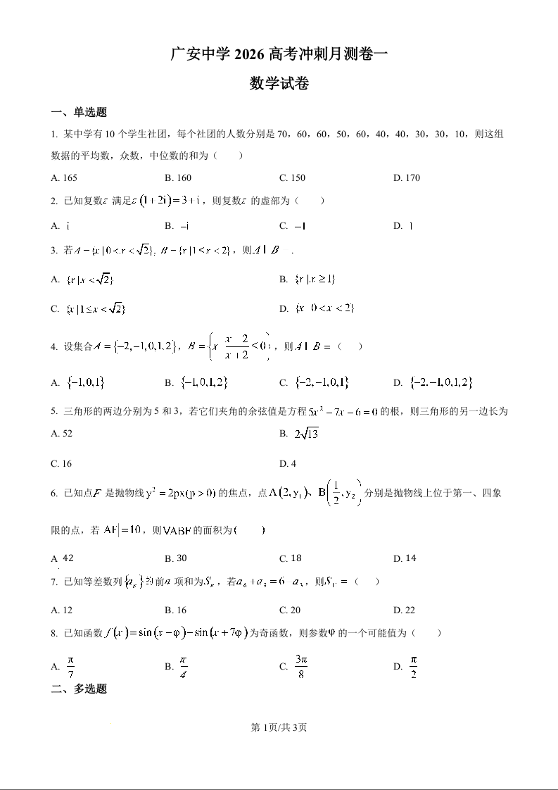 高三数学(原卷版)--四川省广安中学2026届高三上学期冲刺月测(一)