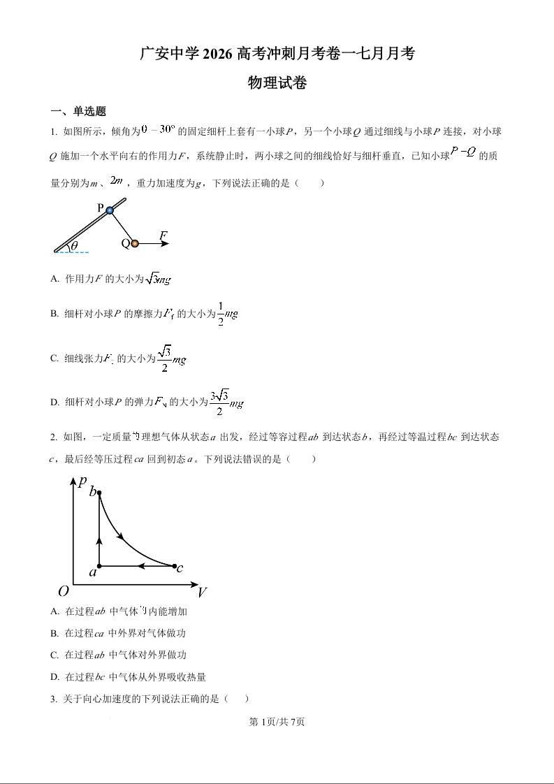 高三物理(原卷版)--四川省广安中学2026届高三上学期冲刺月测(一)