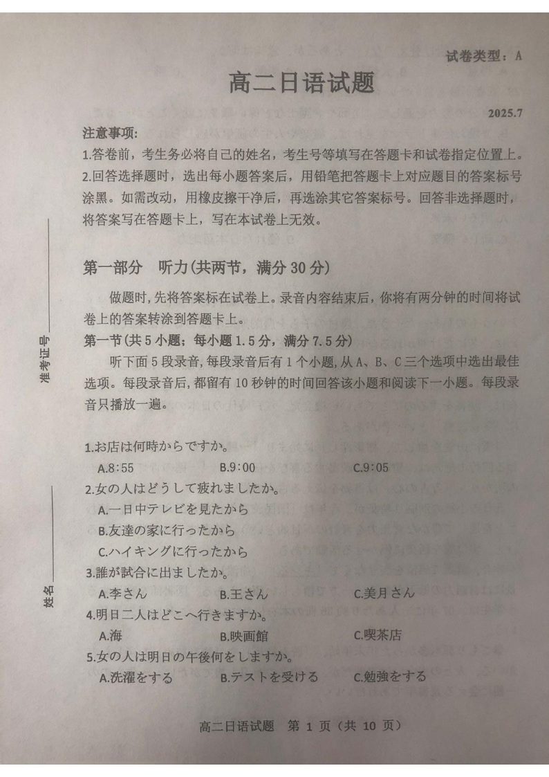 高二日语+答案--山东省滨州市2024-2025学年高二下学期期末考试