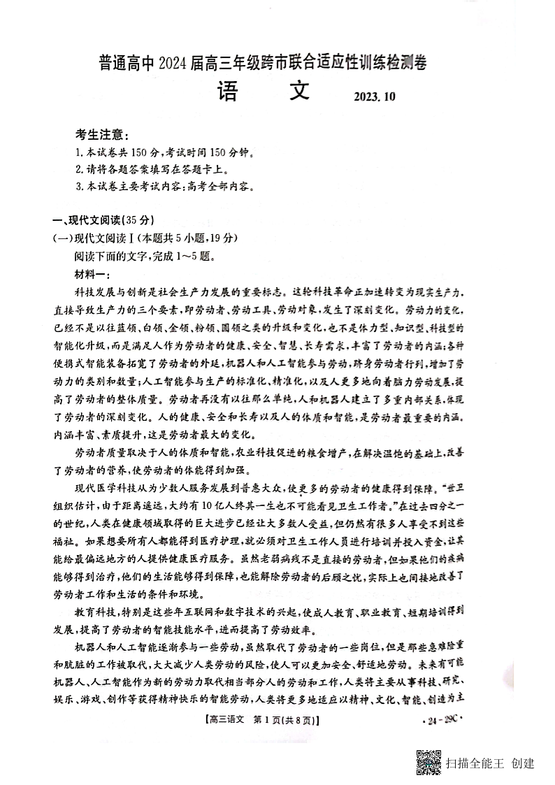 广西普通高中2024届高三年级跨市联合适应性训练检测卷语文