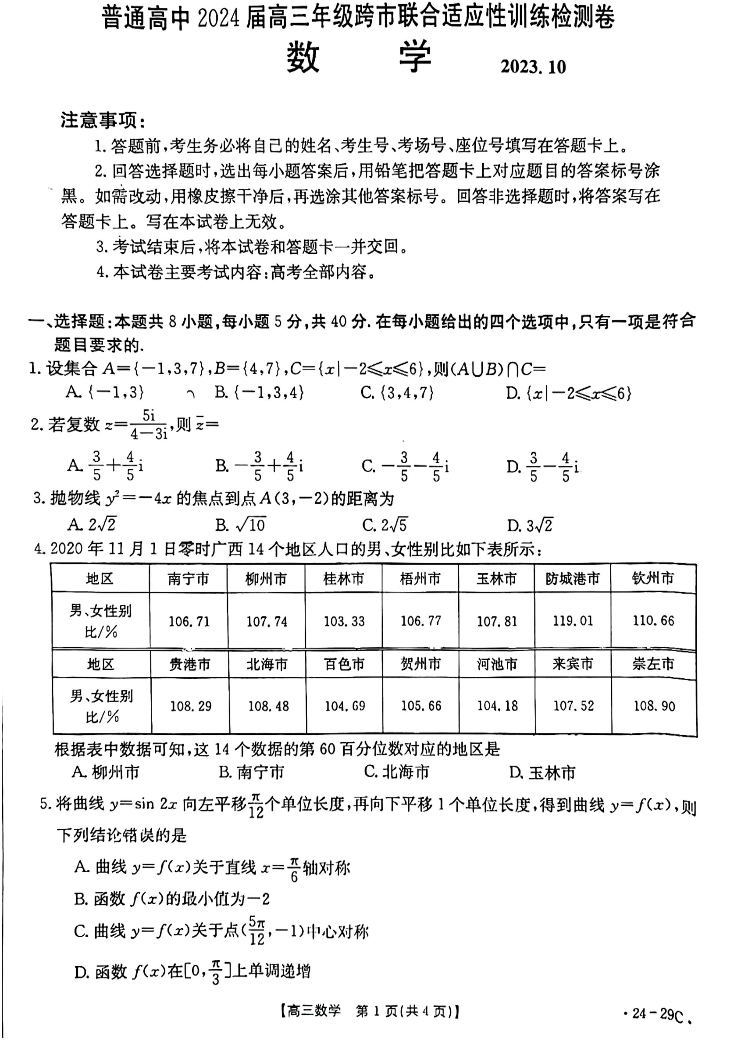 广西普通高中2024届高三年级跨市联合适应性训练检测卷数学