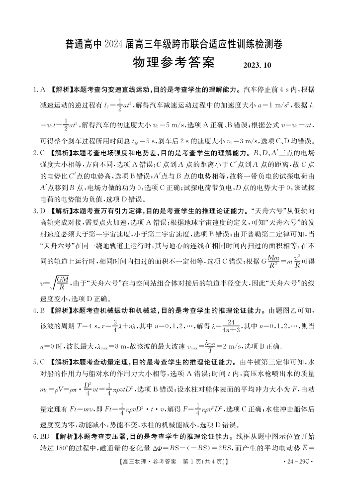 广西普通高中2024届高三年级跨市联合适应性训练检测卷物理答案