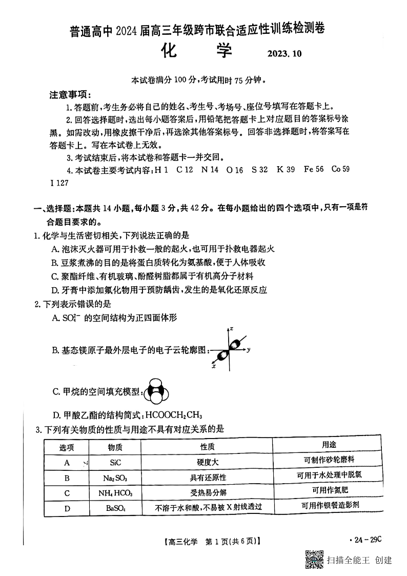广西普通高中2024届高三年级跨市联合适应性训练检测卷化学
