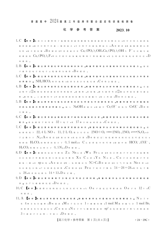 广西普通高中2024届高三年级跨市联合适应性训练检测卷化学答案