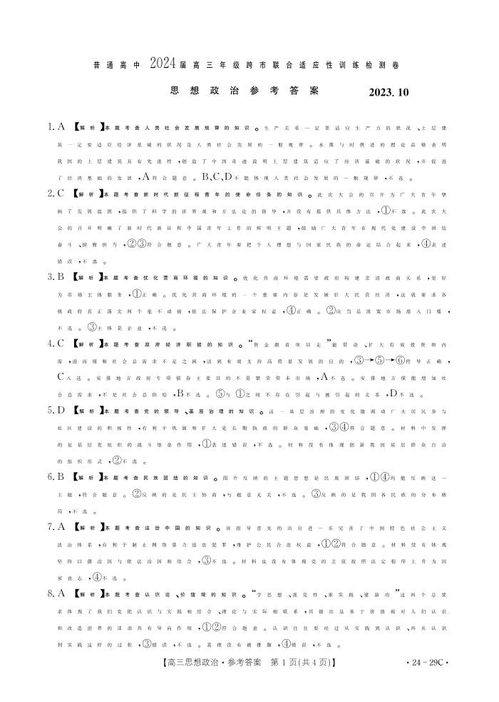 广西普通高中2024届高三年级跨市联合适应性训练检测卷思想政治答案