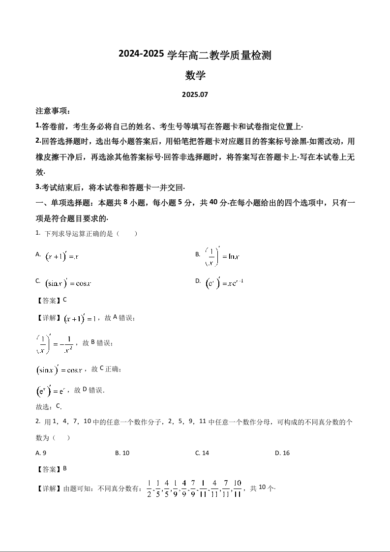 高二数学+答案--山东省枣庄市2024-2025学年高二下学期期末考试