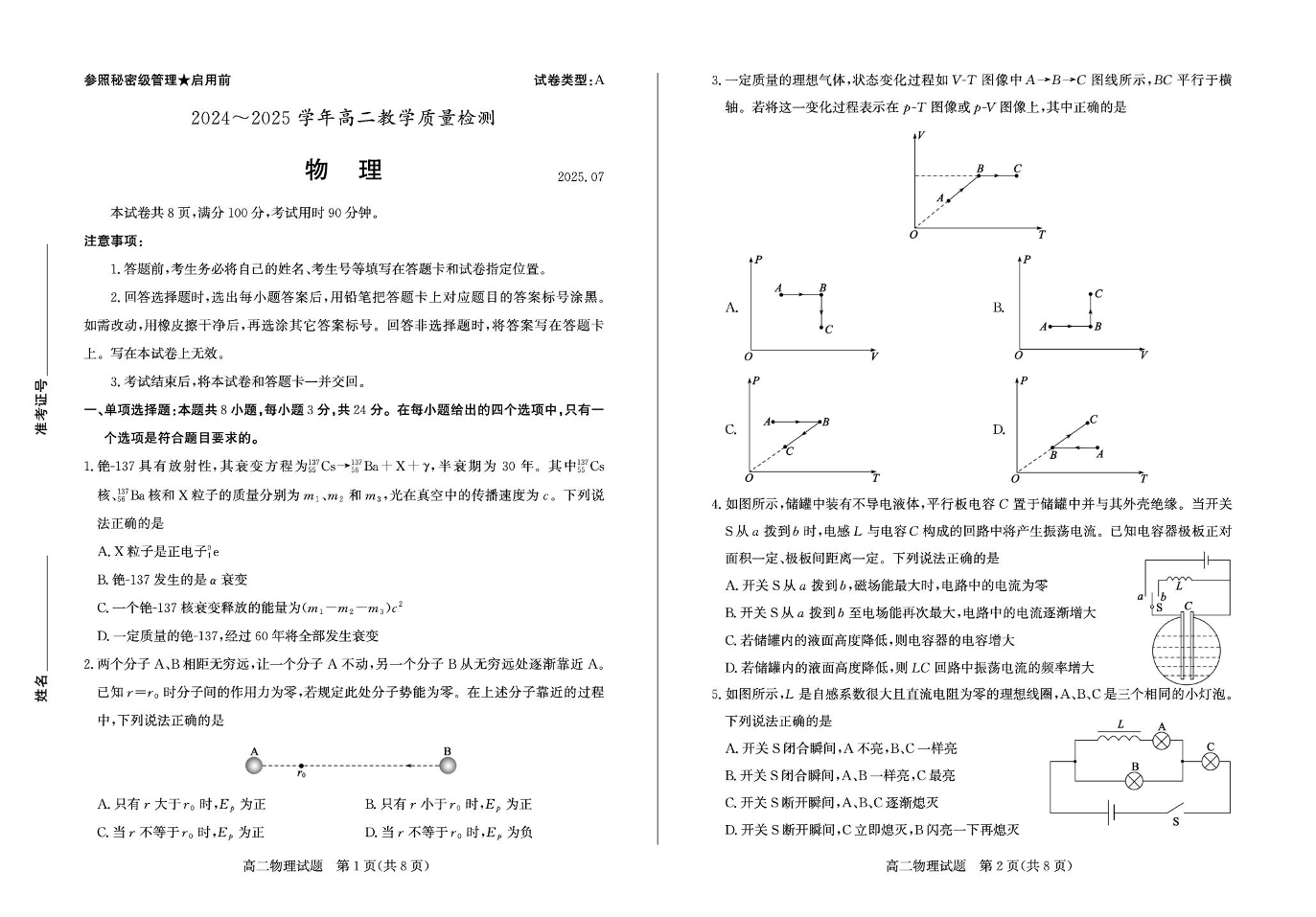 高二物理+答案--山东省枣庄市2024-2025学年高二下学期期末考试