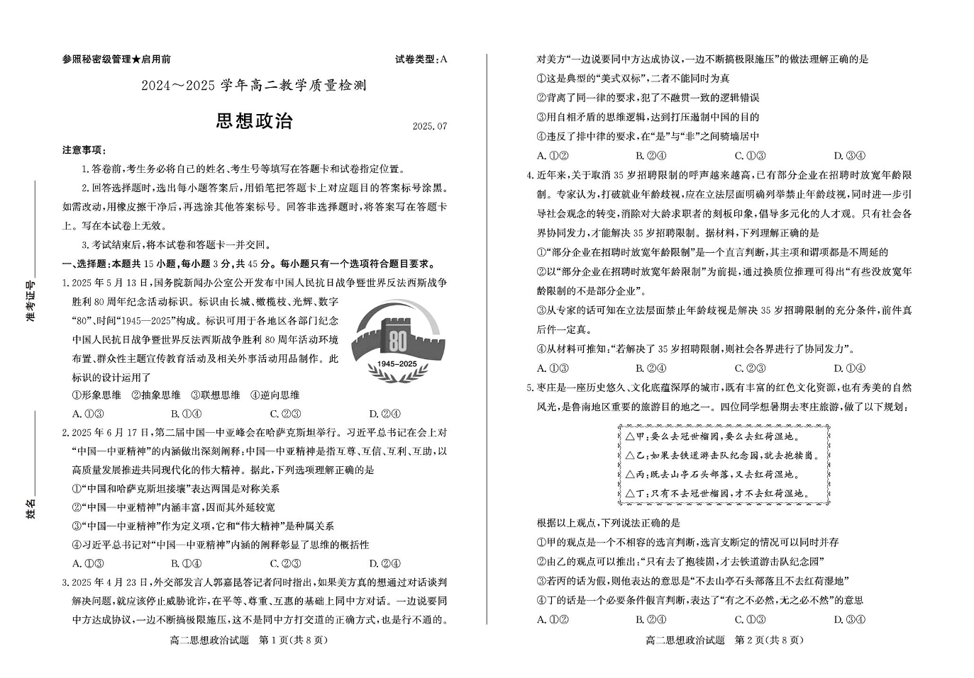 高二政治+答案--山东省枣庄市2024-2025学年高二下学期期末考试