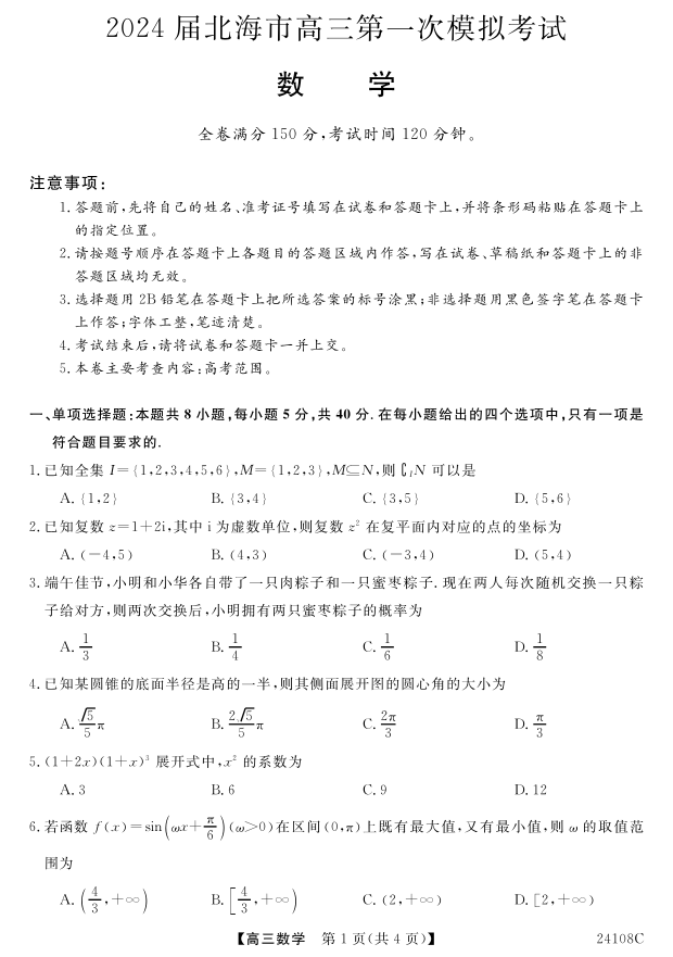 广西北海市2024届高三第一次模拟考试数学