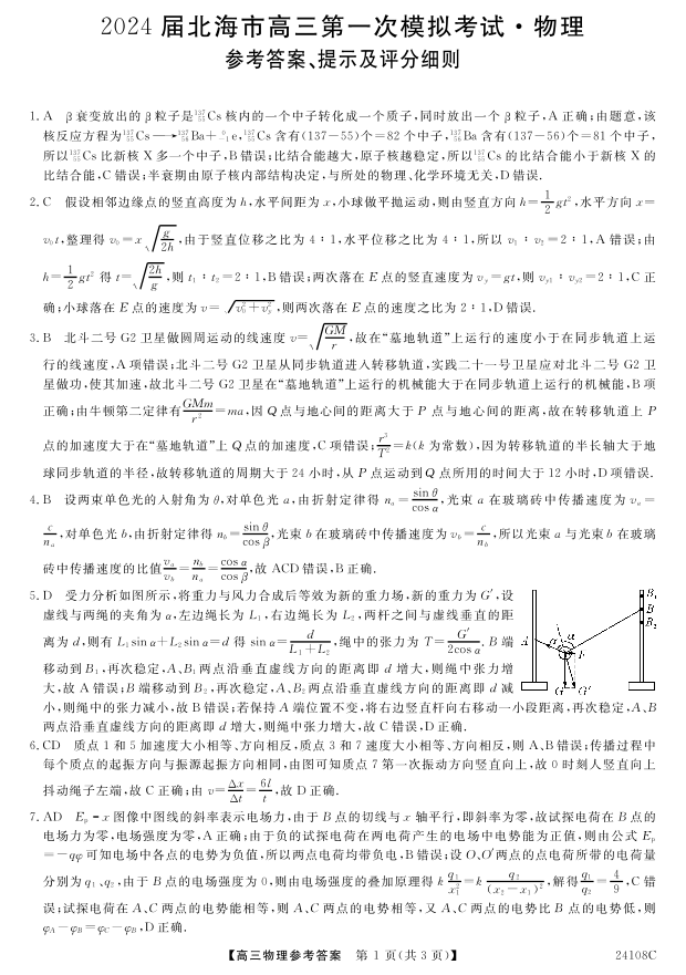 广西北海市2024届高三第一次模拟考试物理答案