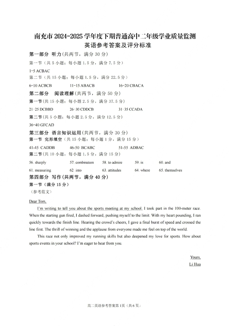 高二英语答案--四川省南充市2024-2025学年高二下学期期末考试