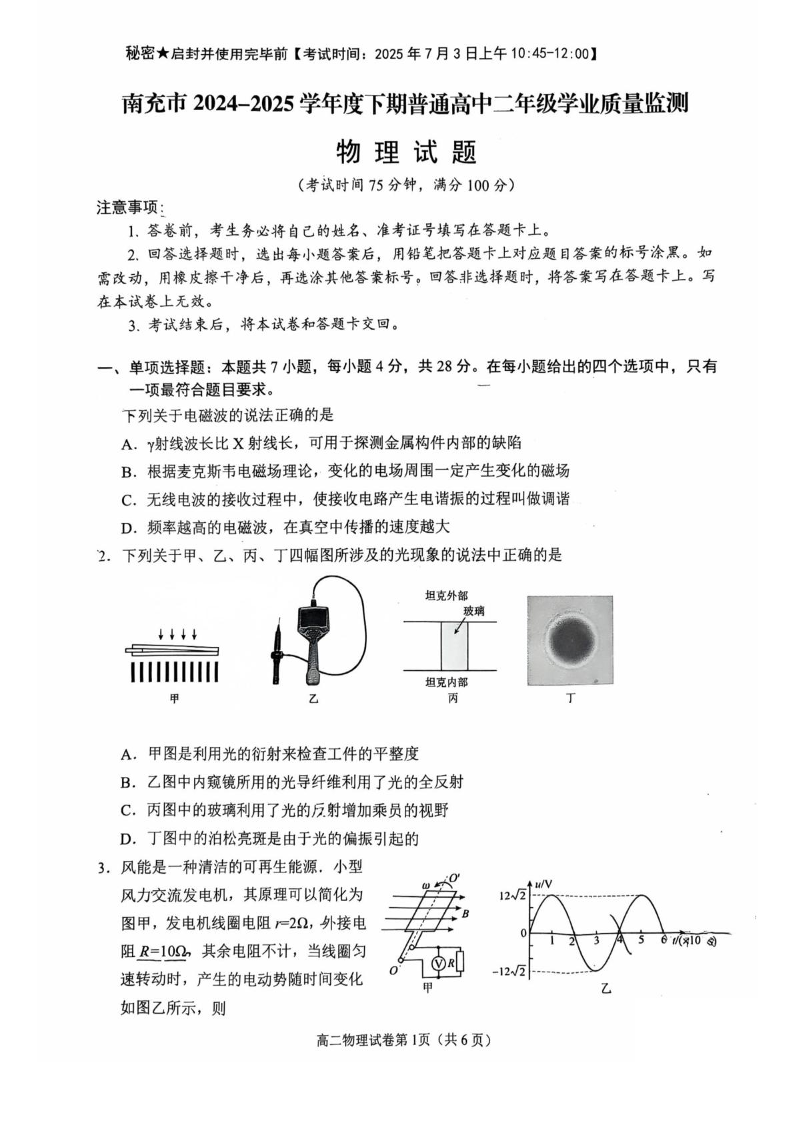 高二物理+答案--四川省南充市2024-2025学年高二下学期期末考试