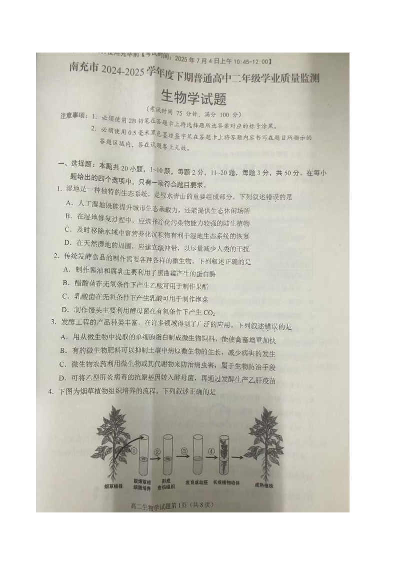 高二生物+答案--四川省南充市2024-2025学年高二下学期期末考试