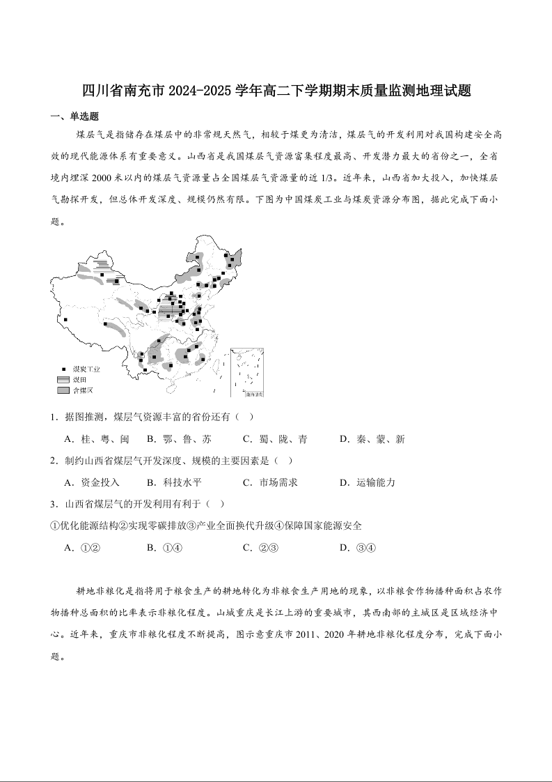 高二地理+答案--四川省南充市2024-2025学年高二下学期期末考试