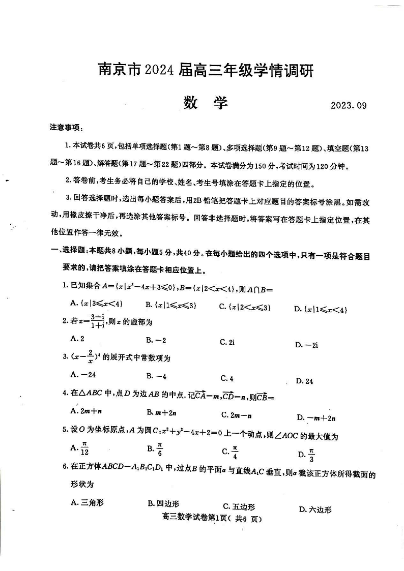 江苏省南京市 2024 届高三年级9月学情调研数学+答案