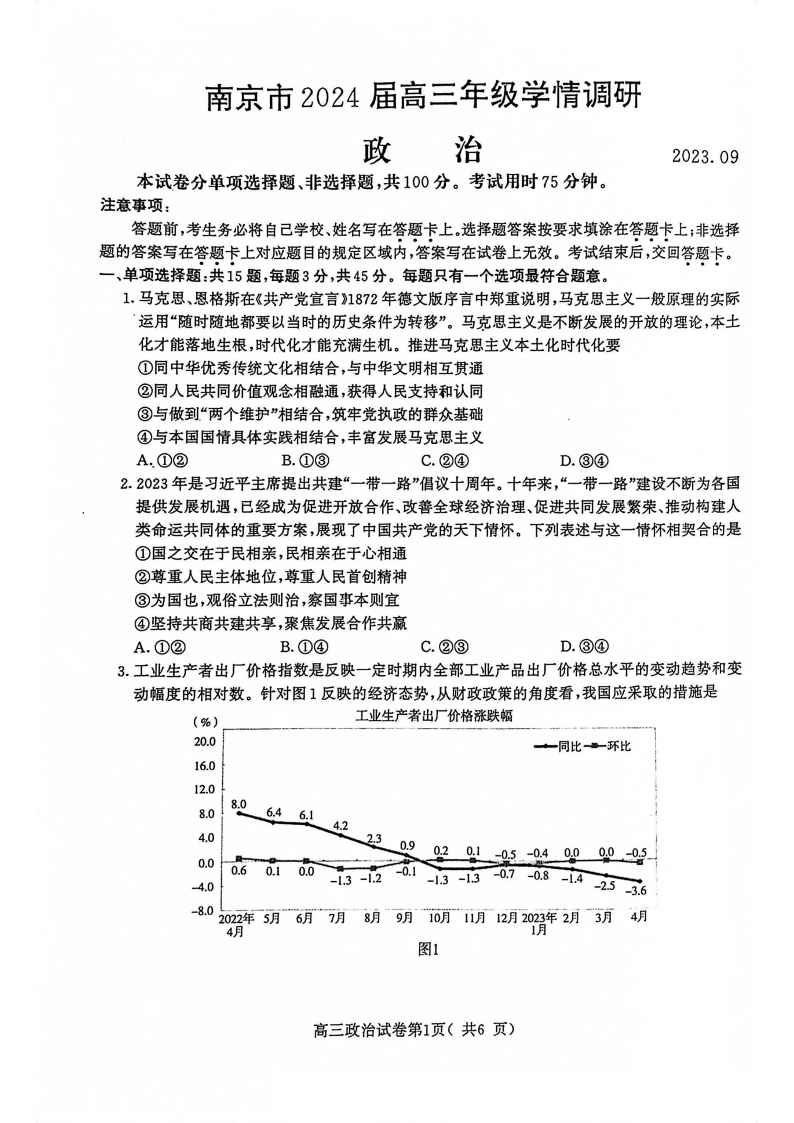 江苏省南京市 2024 届高三年级9月学情调研政治+答案
