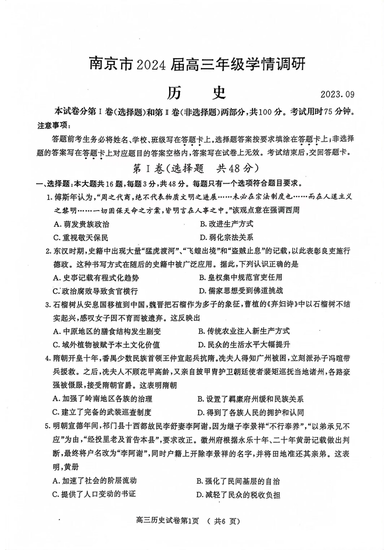江苏省南京市 2024 届高三年级9月学情调研历史+答案