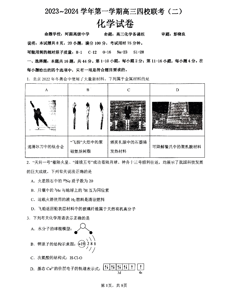 广东省四校联考2024届高三上学期10月月考化学