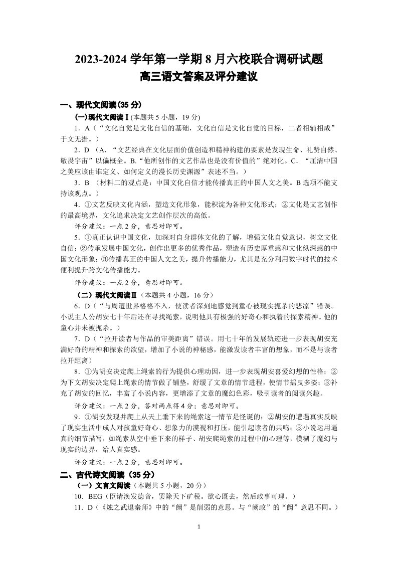 江苏省南京市六校联合体2024届高三上学期8月调研语文答案