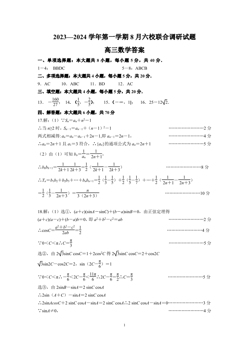 江苏省南京市六校联合体2024届高三上学期8月调研数学答案