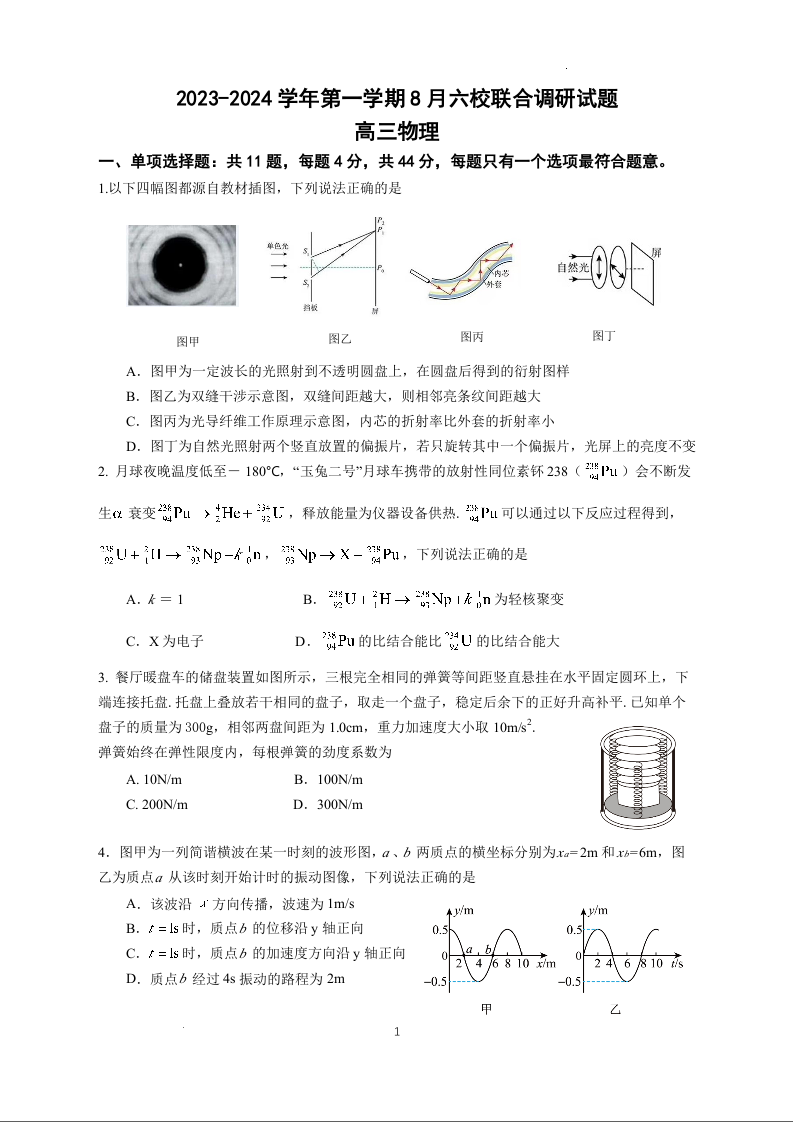 江苏省南京市六校联合体2024届高三上学期8月调研物理