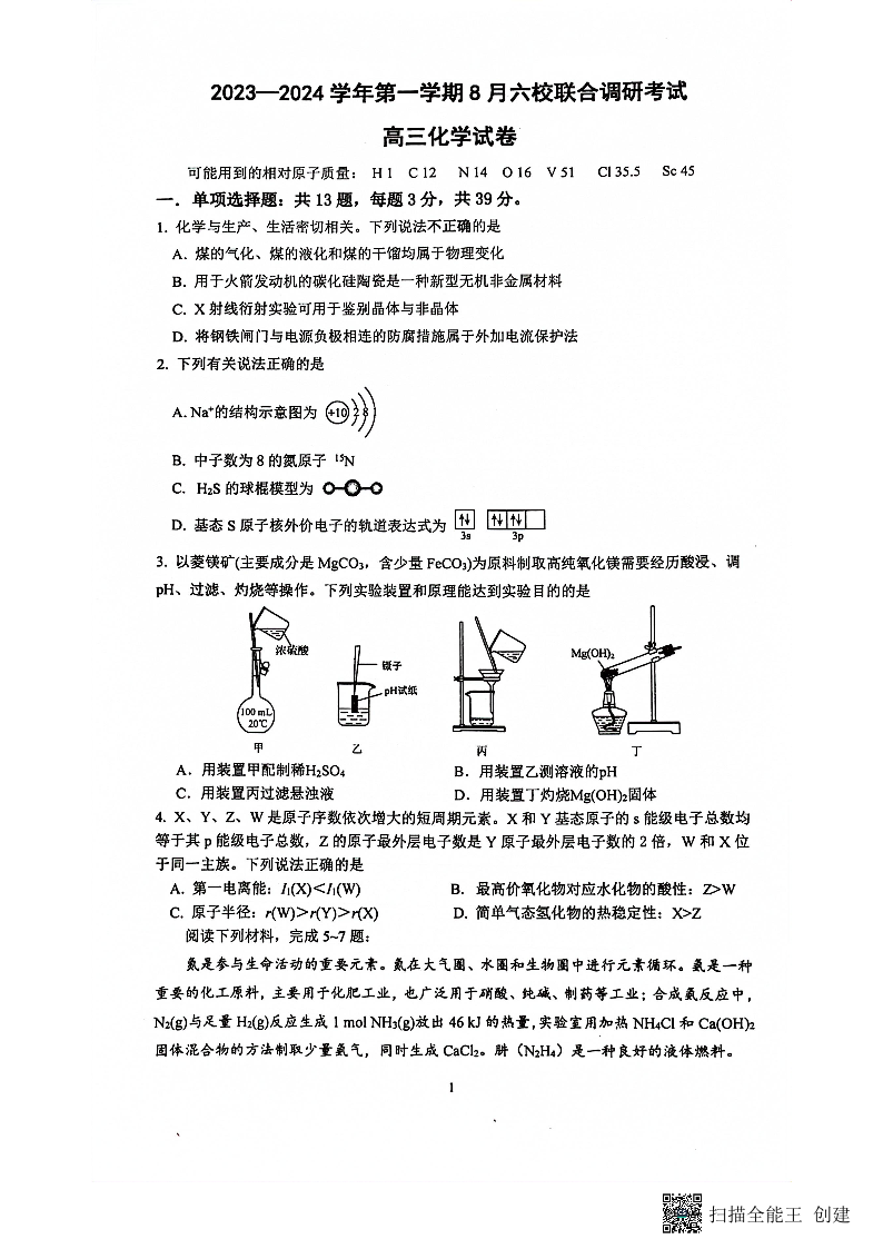 江苏省南京市六校联合体2024届高三上学期8月调研化学