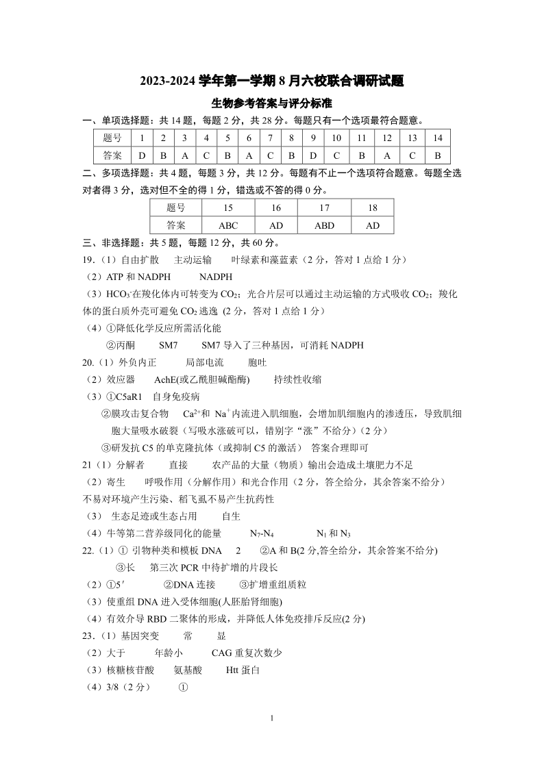 江苏省南京市六校联合体2024届高三上学期8月调研生物答案