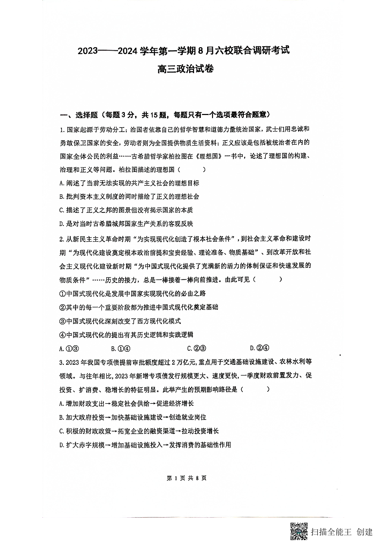 江苏省南京市六校联合体2024届高三上学期8月调研政治