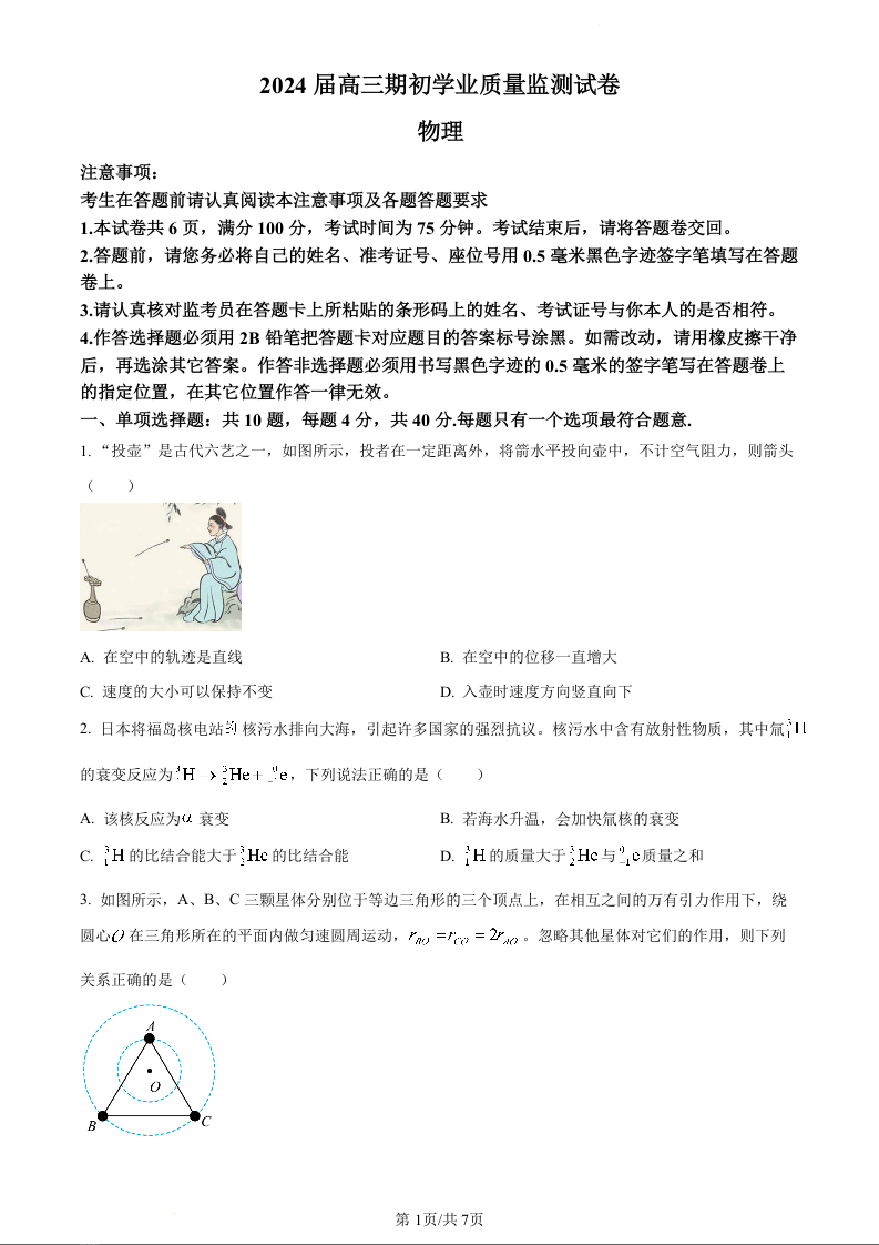 江苏省南通市海安市2024届高三上学期开学考试物理(原卷版)