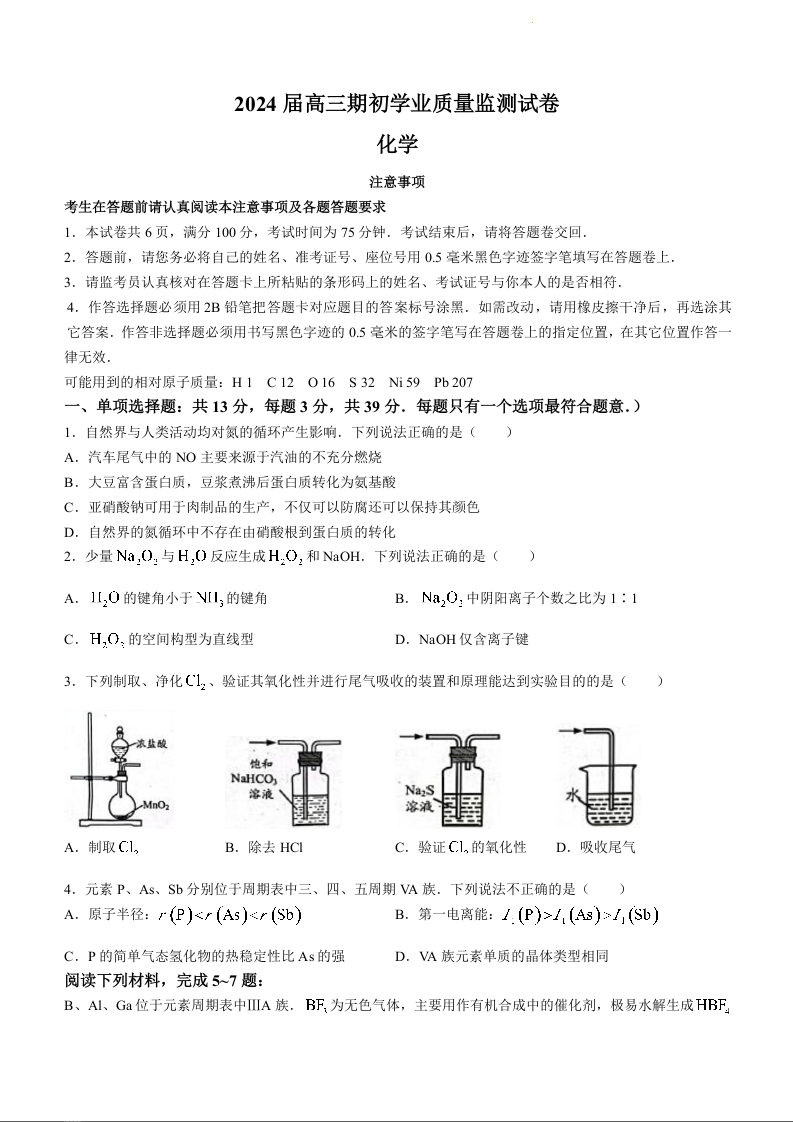江苏省南通市海安市2024届高三上学期开学考试化学