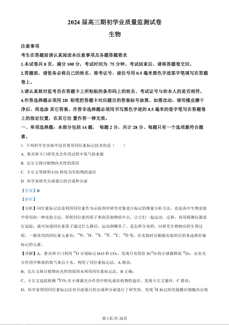 江苏省南通市海安市2024届高三上学期开学考试生物(精品解析版)