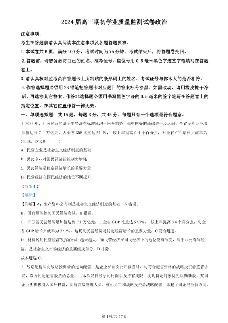 江苏省南通市海安市2024届高三上学期开学考试政治(精品解析版)