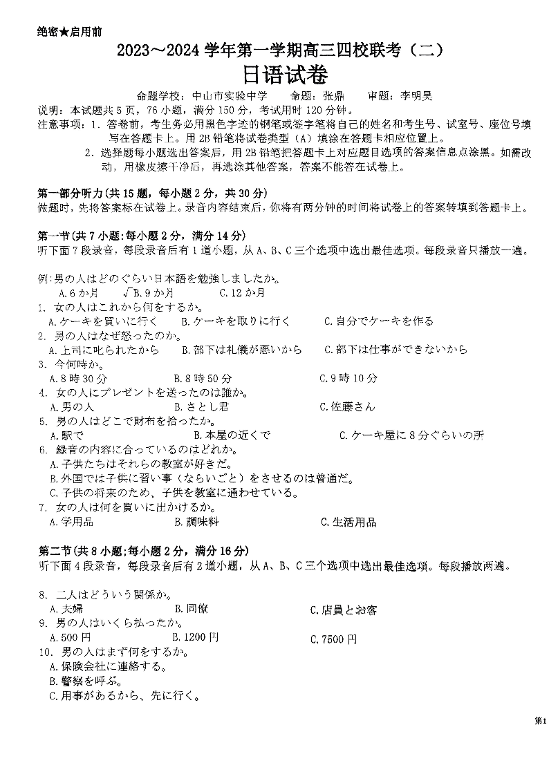 广东省四校联考2024届高三上学期10月月考日语