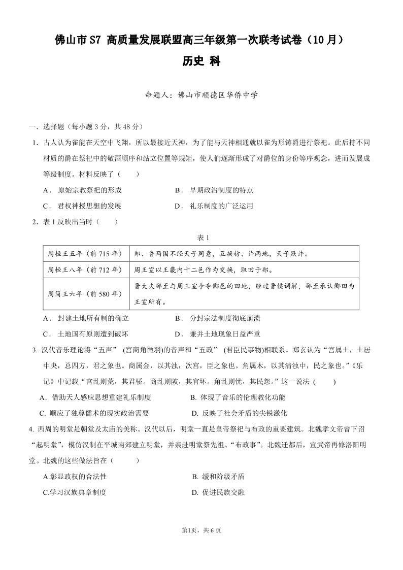 广东省佛山市S7高质量发展联盟2024届高三上学期联考历史