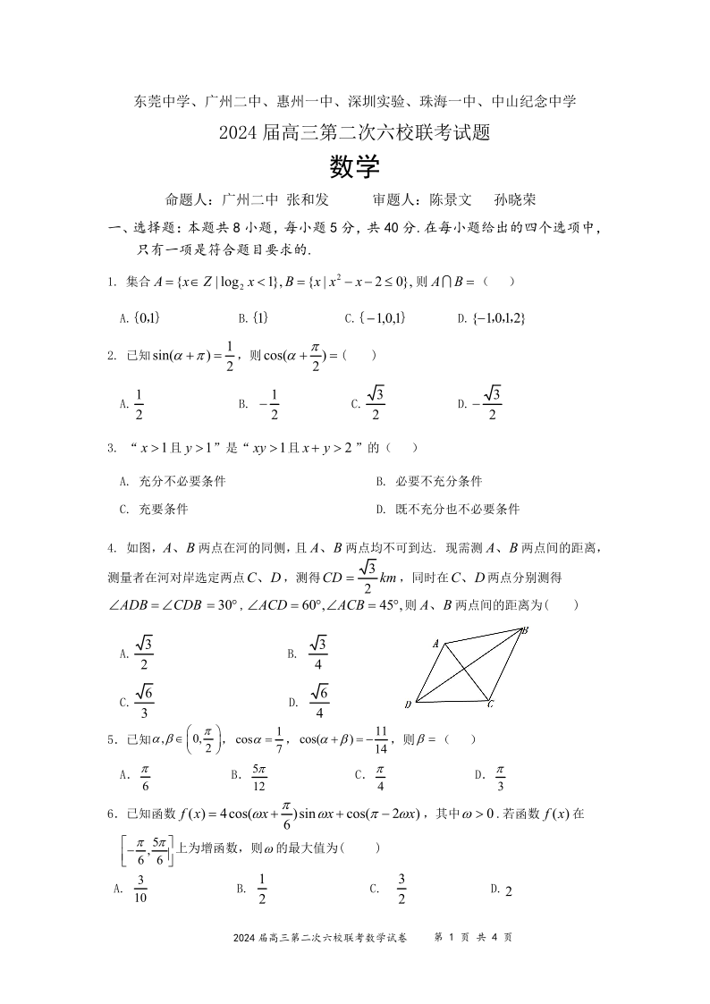 广东省2024届高三第二次六校联考数学