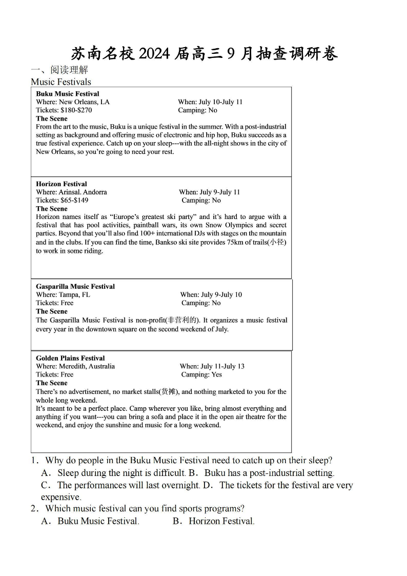 江苏省苏南名校2024届高三9月抽查调研英语+答案