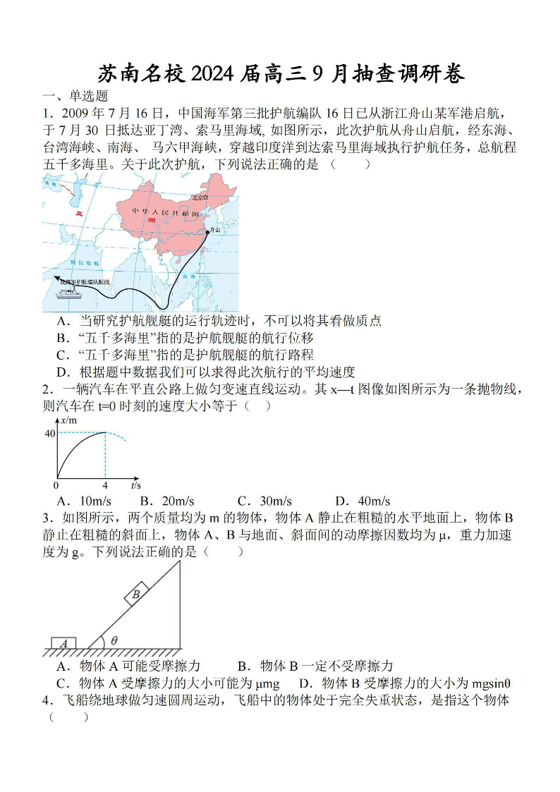 江苏省苏南名校2024届高三9月抽查调研物理+答案
