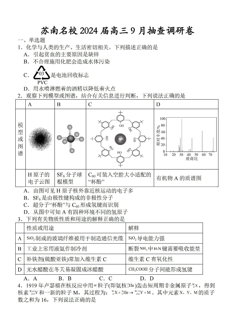 江苏省苏南名校2024届高三9月抽查调研化学+答案