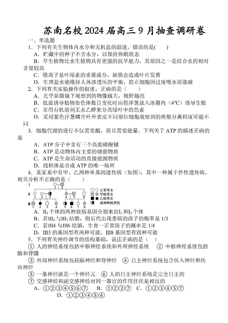 江苏省苏南名校2024届高三9月抽查调研生物+答案