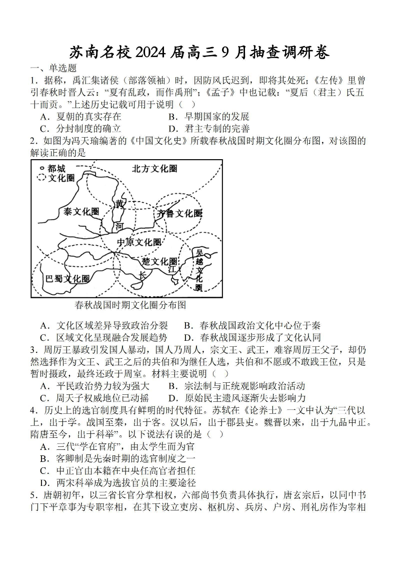 江苏省苏南名校2024届高三9月抽查调研历史+答案