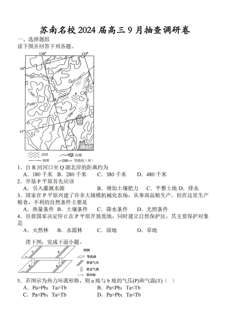 江苏省苏南名校2024届高三9月抽查调研地理+答案