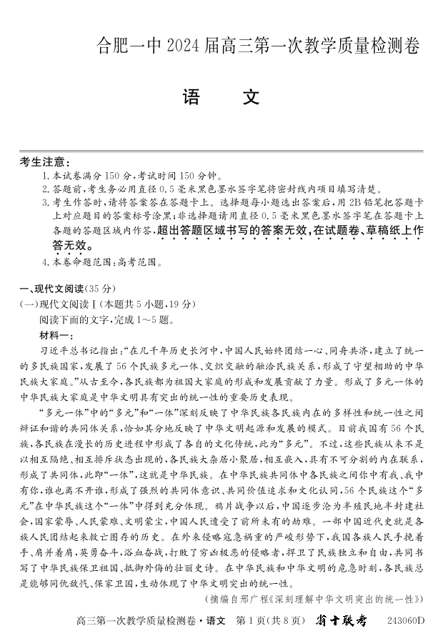 安徽省合肥市第一中学2024届高三上学期第一次教学质量检测语文+答案