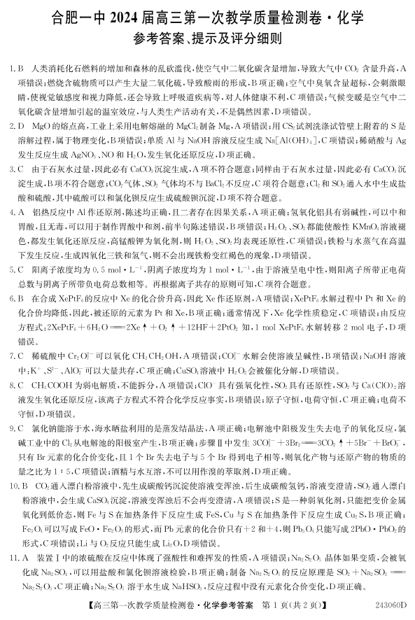 安徽省合肥市第一中学2024届高三上学期第一次教学质量检测化学答案