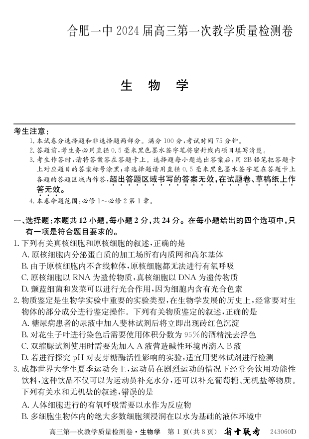 安徽省合肥市第一中学2024届高三上学期第一次教学质量检测生物+答案