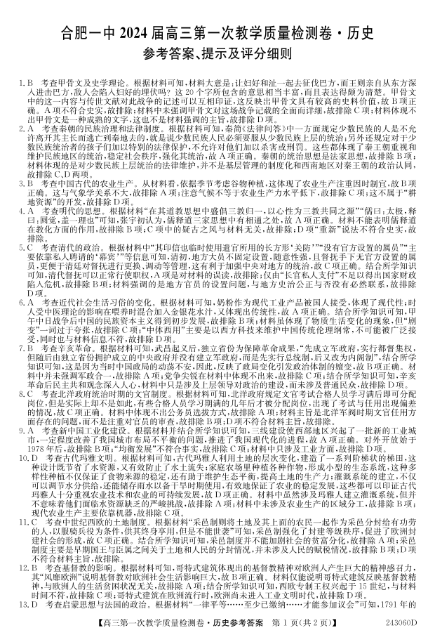安徽省合肥市第一中学2024届高三上学期第一次教学质量检测历史答案