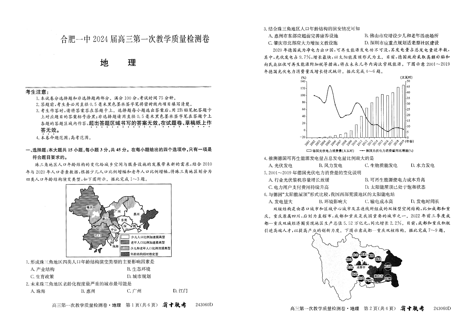 安徽省合肥市第一中学2024届高三上学期第一次教学质量检测地理