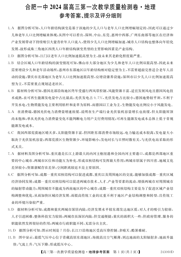 安徽省合肥市第一中学2024届高三上学期第一次教学质量检测地理答案
