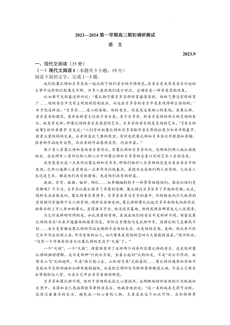 江苏省苏州市2024届高三上学期期初调研测试语文
