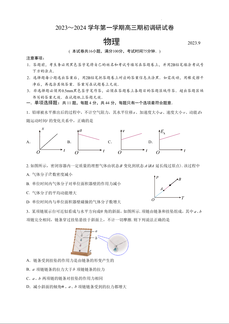江苏省苏州市2024届高三上学期期初调研测试物理