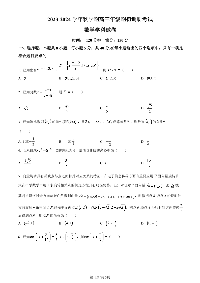 江苏省泰州中学2024届高三上学期期初调研考试数学(原卷版)